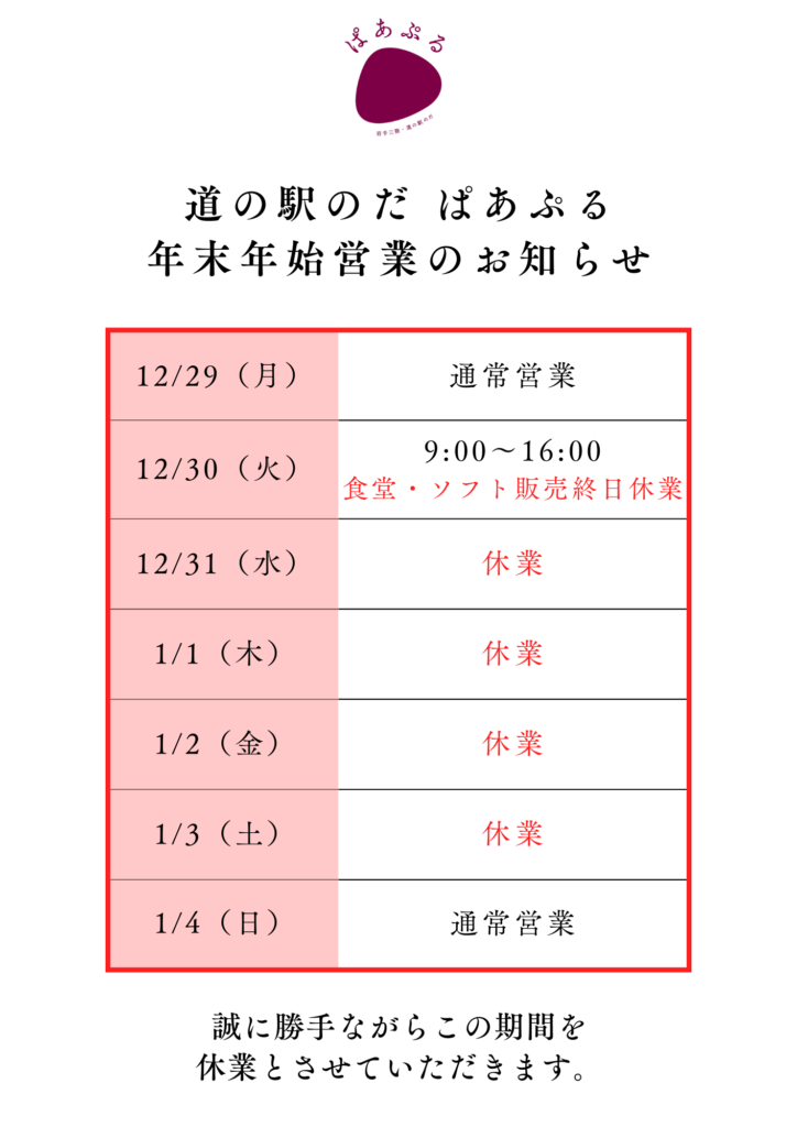 道の駅のだ ぱあぷるの年末年始営業は下記の通りです。